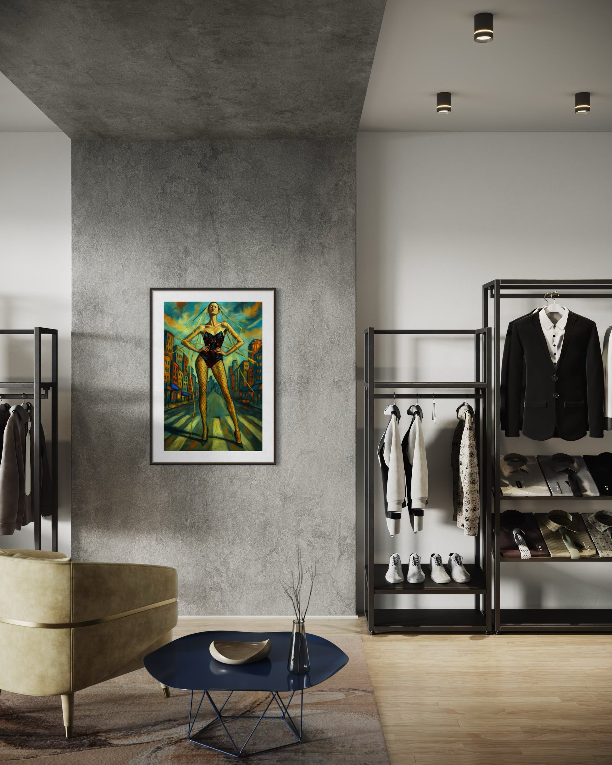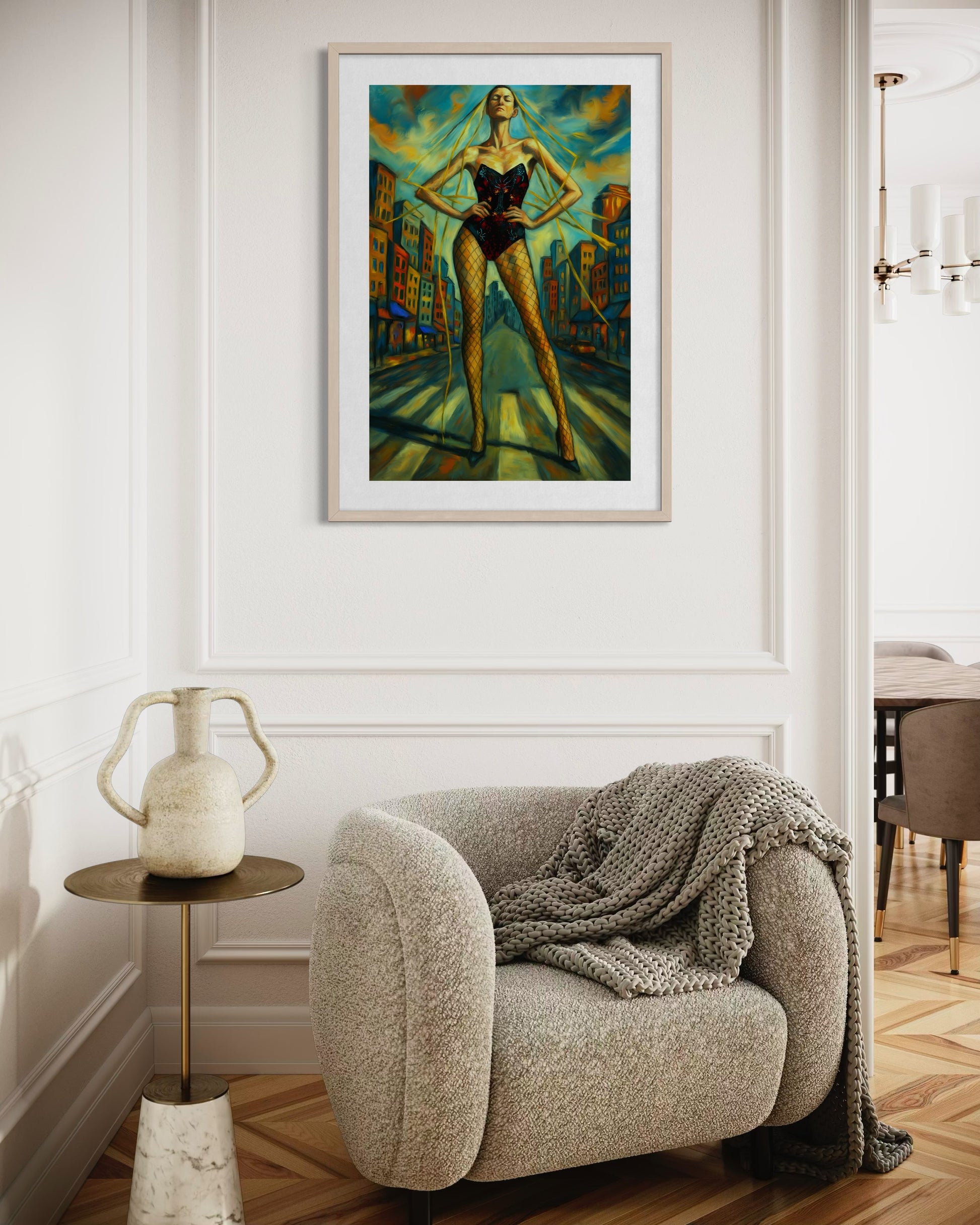 Şehrin dinamizmi ile kadının duruşu arasındaki gerilim, güçlü renk geçişleri ve dramatik ışıkla birleşerek her mekâna çarpıcı bir enerji taşır. Bu eser, 60x91 cm boyutunda iki farklı sunum seçeneği ile sunulur: